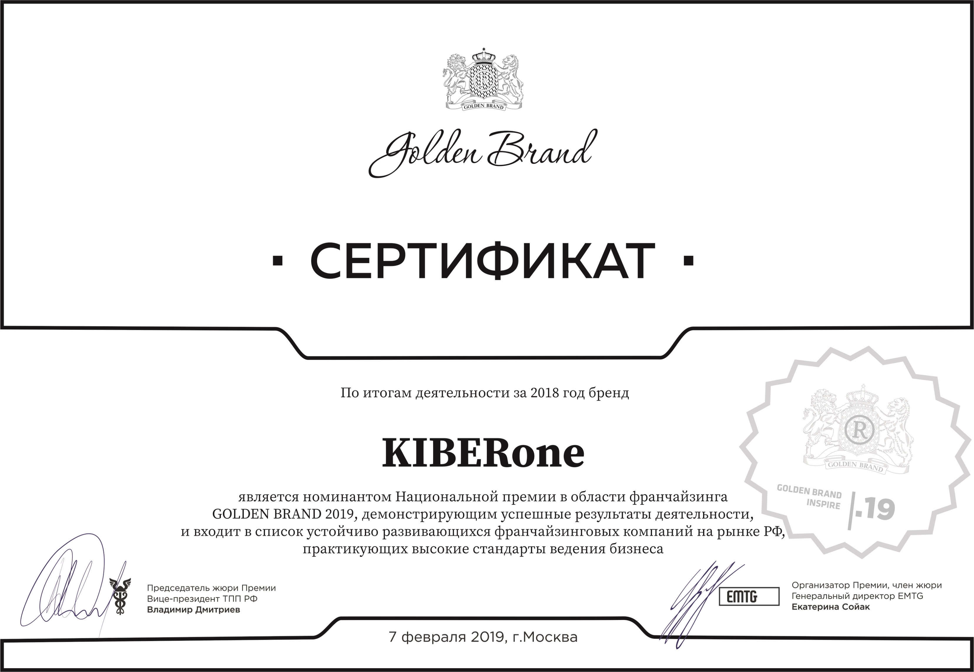 Нoминант ПРОРЫВ ГОДА в Национальной премии в области франчайзинга Golden Brand 2019